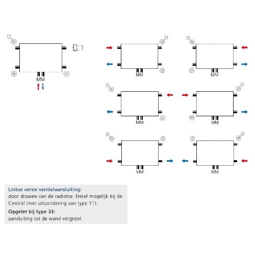 - Onderaansluiting, gezien vanaf de voorzijde: aanvoer = links, retour = rechts