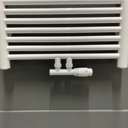 Fraai onderblok voor radiatoren met een onderaansluiting waarbij de leidingen uit de muur komen. Deze haakse set wordt geleverd inclusief thermostaatknop, 2 aansluitkoppelingen naar flexibele buis (16x2) en 2 aansluitkoppelingen naar cv-buis (15mm), een rozet (voor op de muur) en 2 nette verlengbusjes om eventueel over de buis heen te schuiven.