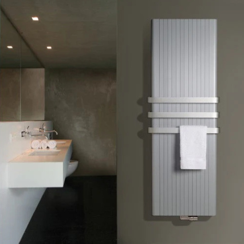 Mooie Vasco Alu-Zen V100 verticale aluminium designradiator in de kleur Grijs, RAL 7046. Deze designradiator is zeer geschikt voor de badkamer. Het materiaal zelf, maar ook de afgeronde zijprofielen en de minimale verticale groeven versterken dat effect.